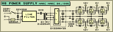 . . . Power Supply The diagram below shows the power supply for the V8 unit. It is a straight forward design with the popular 78xx and 79xx regulators. The supply delivers 3 regulated voltages for both the positive and negative supply.